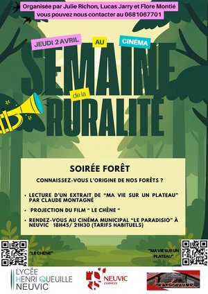 Les étudiants de BTSA Gestion et Protection de la Nature et de BTSA Développement et Animation de projets Territoriaux du Lycée Henri Queuille de Neuvic, les associations ATSAN et Fourminioles, et la Ferme du Manus de Neuvic (19), organisent la deuxième édition de la Semaine de la Ruralité, dans Neuvic et alentours.