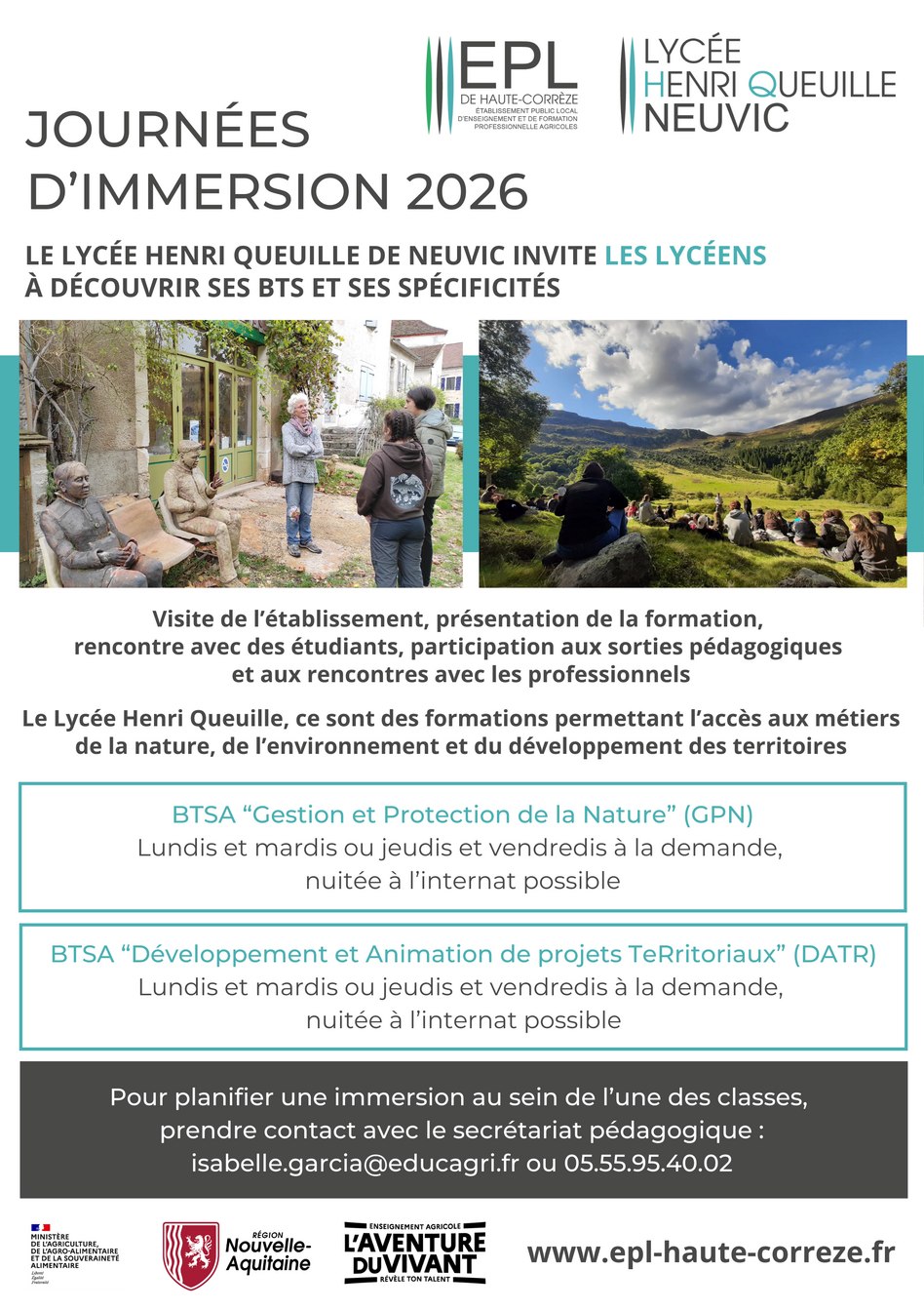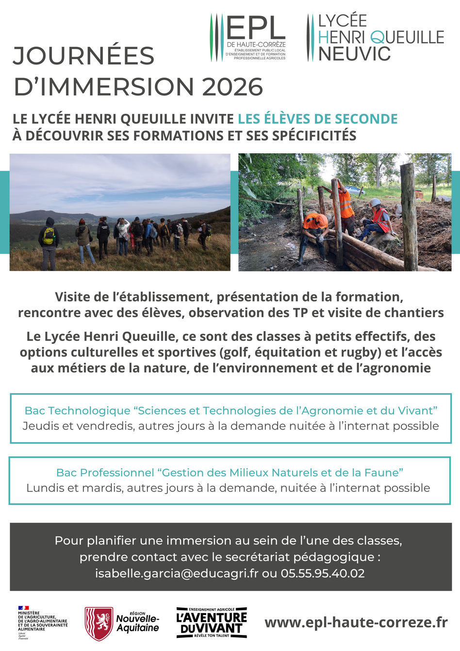 Le Lycée Henri Queuille de Neuvic et le Lycée Forestier de Meymac vous accueillent durant une durée à déterminer ensemble, dans le cadre d'une immersion pour découvrir les formations.